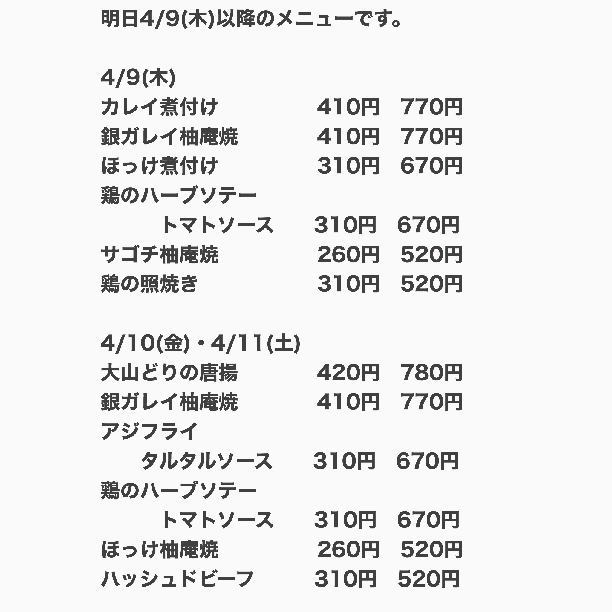 4/9(木)〜4/11(土)のメニューです✨