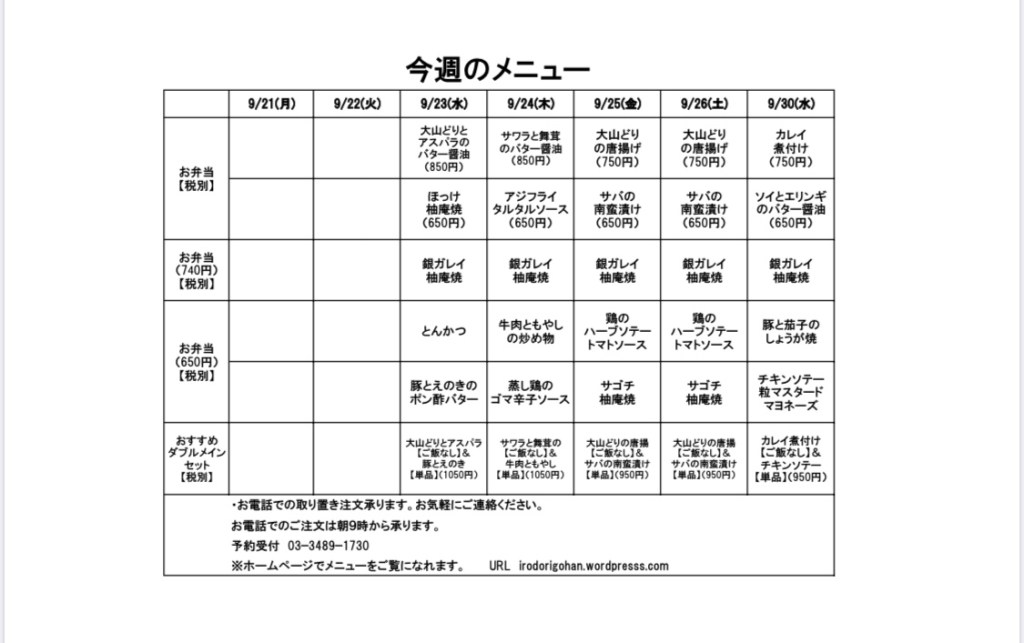 今週のメニュー表をご覧になり、インターネットまたはお電話にてご注文下さい。