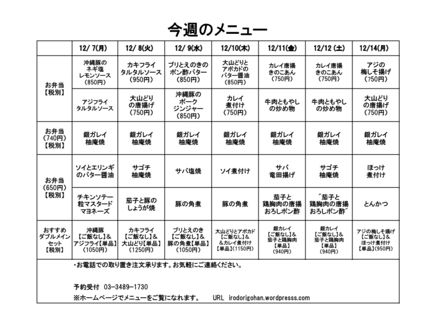 今週のメニュー表をご覧になり、インターネットまたはお電話にてご注文下さい。