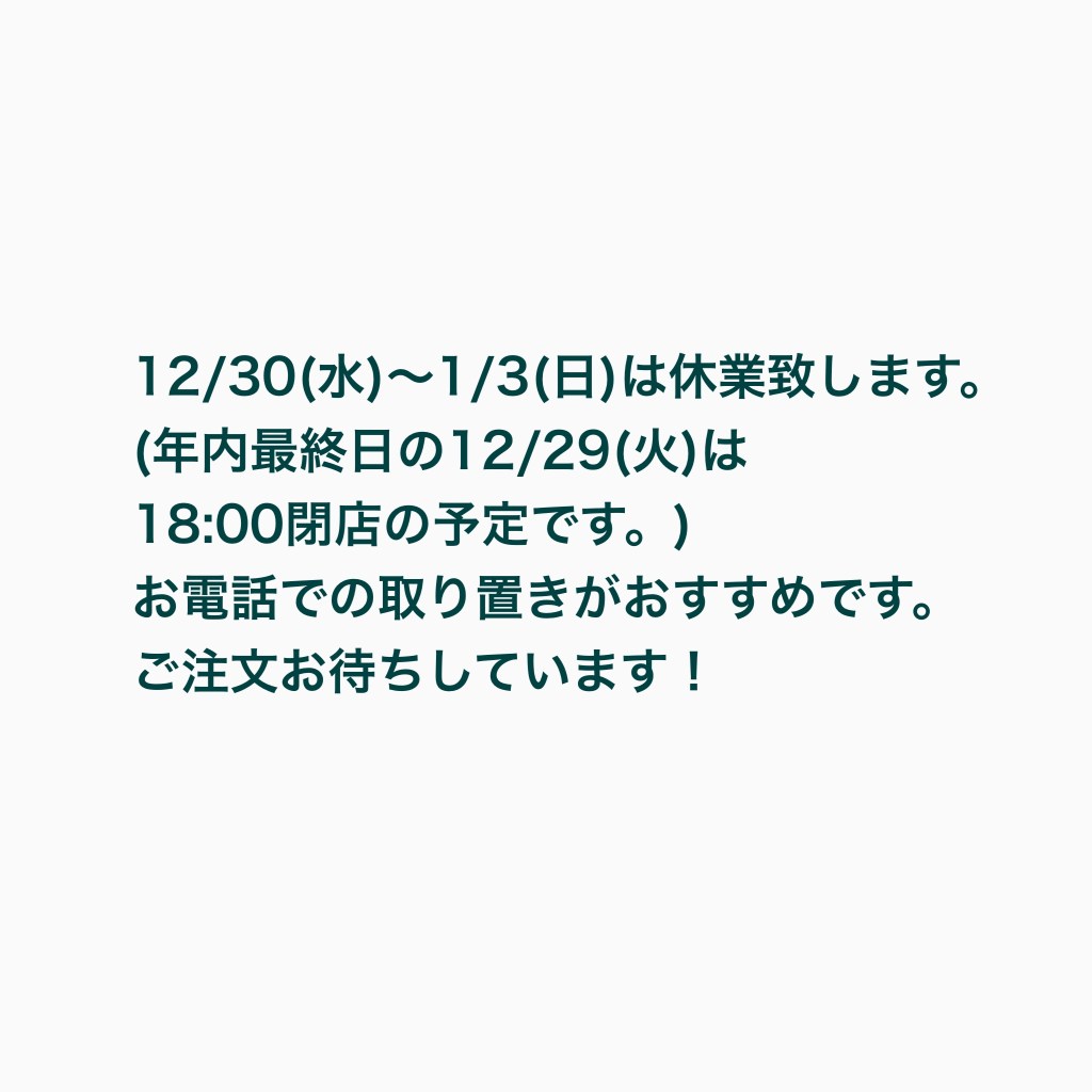 明日は18時で閉店しますのでお早めのご注文をお待ちしています✨