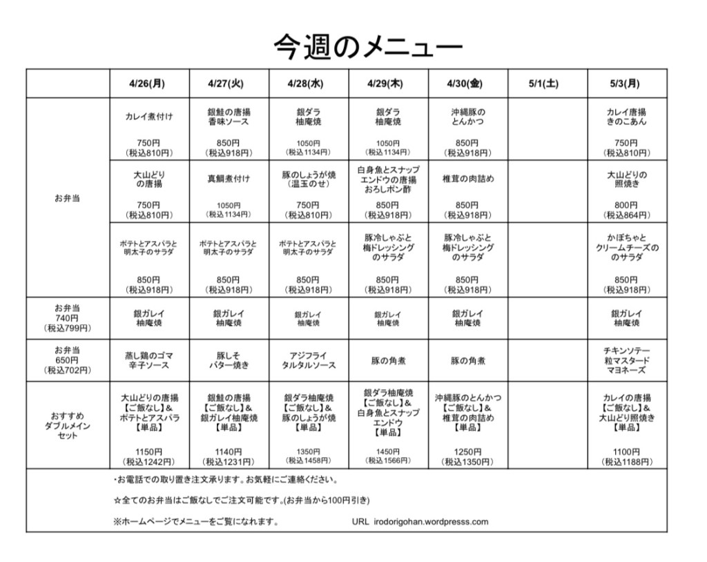 今週のメニュー表をご覧になり、インターネットまたはお電話にてご注文下さい。