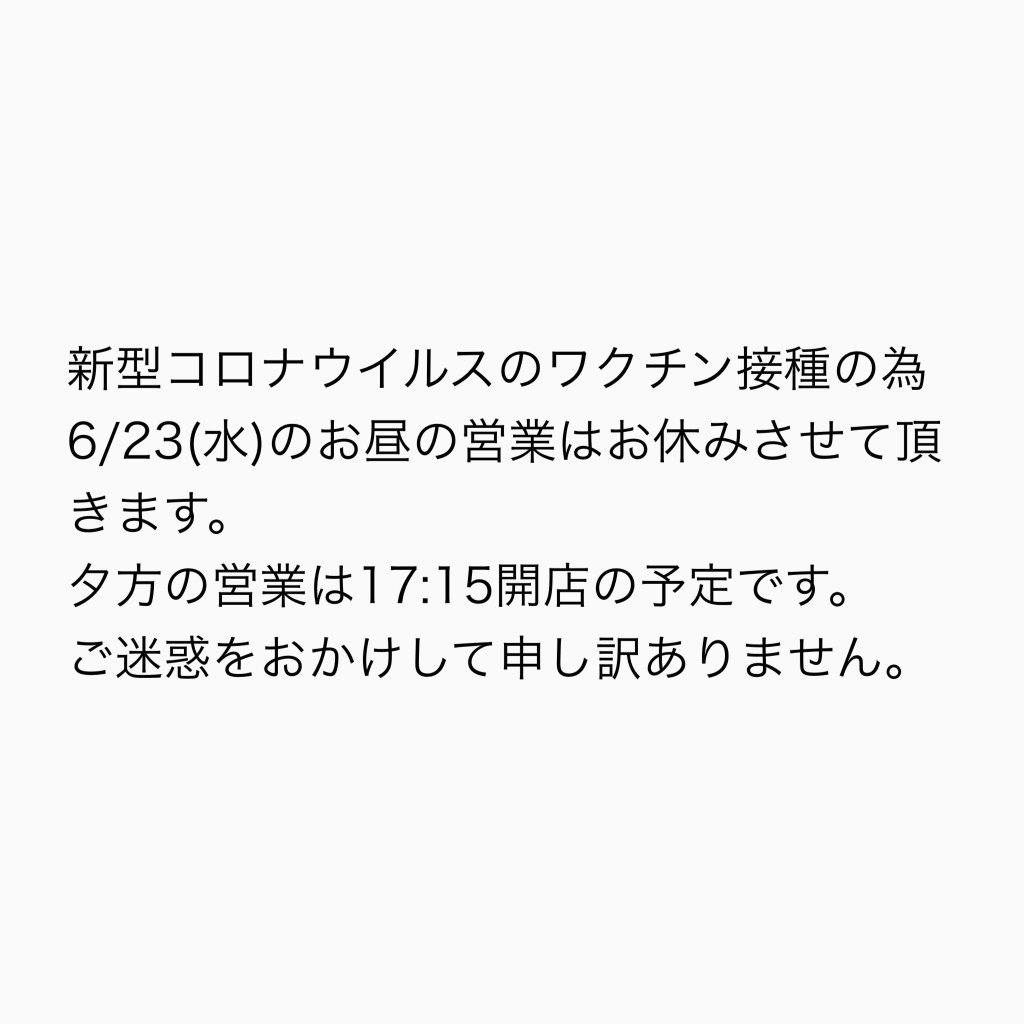 急遽ワクチンの接種が決まり、明日6/23(水)のお昼の営業をお休みさせて頂くことになりました。