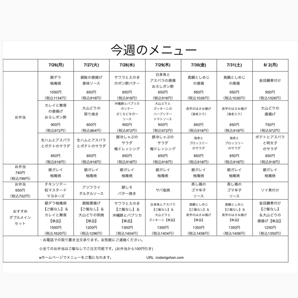 今週のメニュー表をご覧になり、インターネットまたはお電話にてご注文下さい。