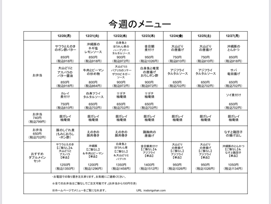 今週のメニュー表をご覧になり、インターネットまたはお電話にてご注文下さい。