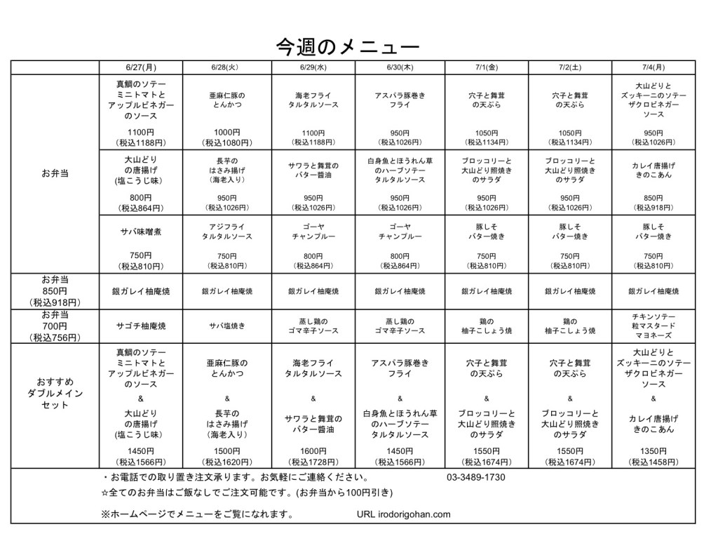 今週のメニュー表をご覧になり、インターネットまたはお電話にてご注文下さい。