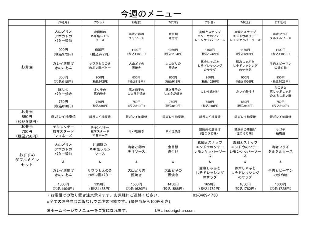 今週のメニュー表をご覧になり、インターネットまたはお電話にてご注文下さい。