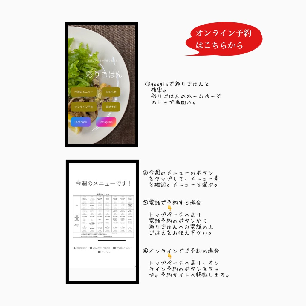 今週のメニュー表をご覧になり、インターネットまたはお電話にてご注文下さい。