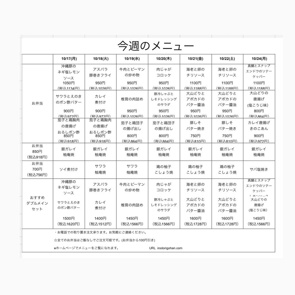 今週のメニュー表をご覧になり、インターネットまたはお電話にてご注文下さい。