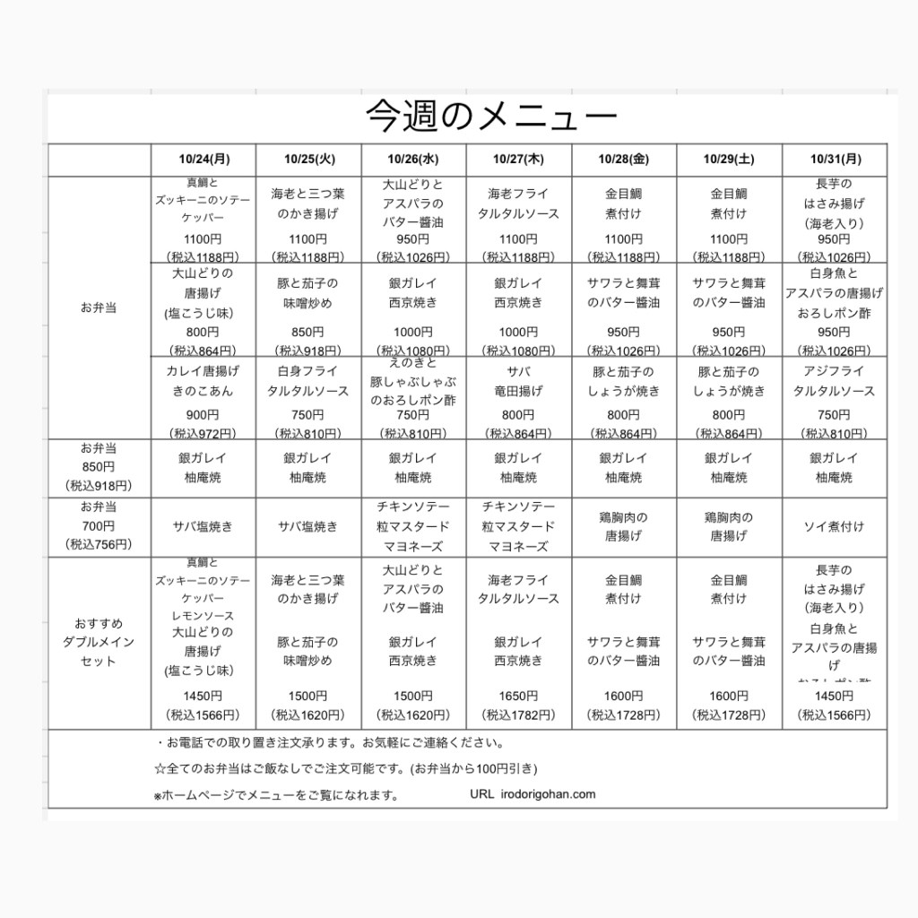 今週のメニュー表をご覧になり、インターネットまたはお電話にてご注文下さい。