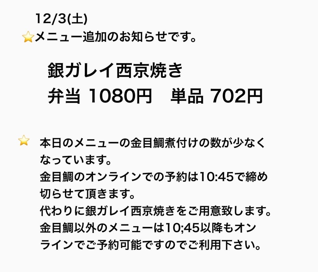 無添加調味料、庄内直送減農薬米を使用した手作りのお弁当をご用意しています!お魚は豊洲市場から直送お魚を使用しています。クセがなくふっくら柔らかいお魚は鮮度のいいしるしですね。