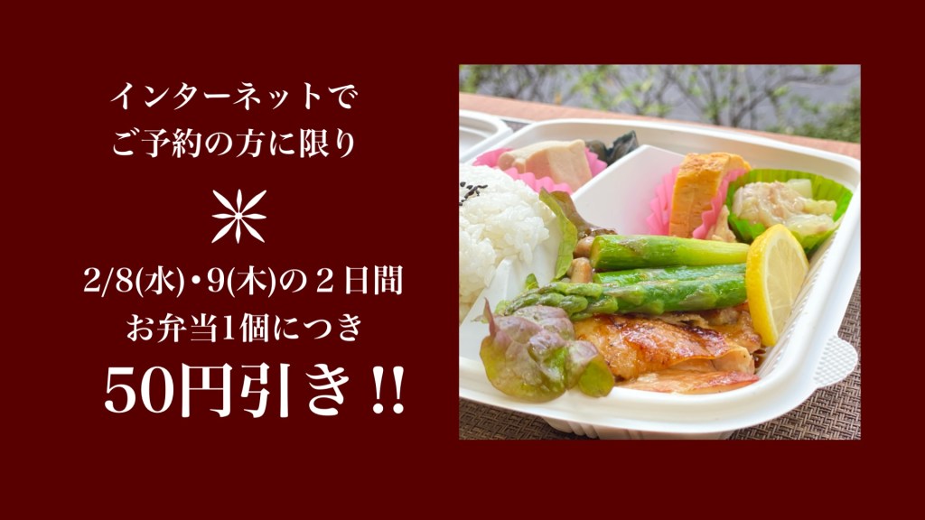 ⭐️インターネットでご予約の方は2/8(水)•9(木)の2日間お弁当1個につき50円引きさせて頂きます!⭐️今回は初めてインターネットでご注文される方も割引させて頂きます。(今回はクーポンコードの入力の必要はありません。店頭にて割引致します。)皆様のご注文をお待ちしております!