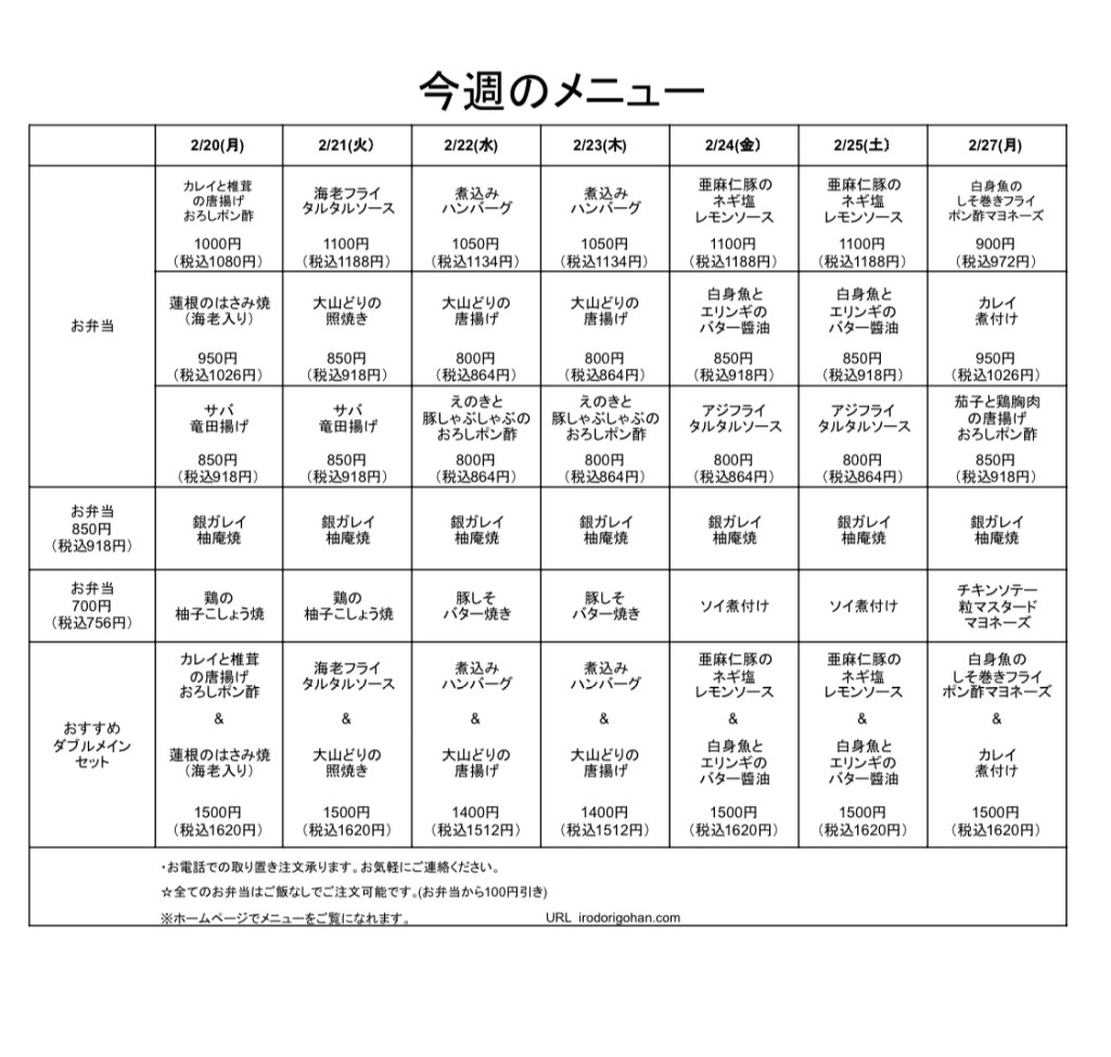 今週のメニュー表をご覧になり、インターネットまたはお電話にてご注文下さい。