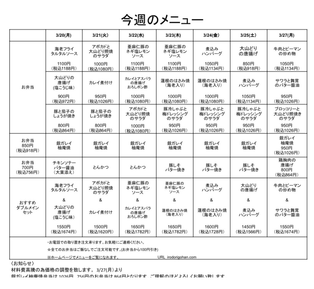 今週のメニュー表をご覧になり、インターネットまたはお電話にてご注文下さい。