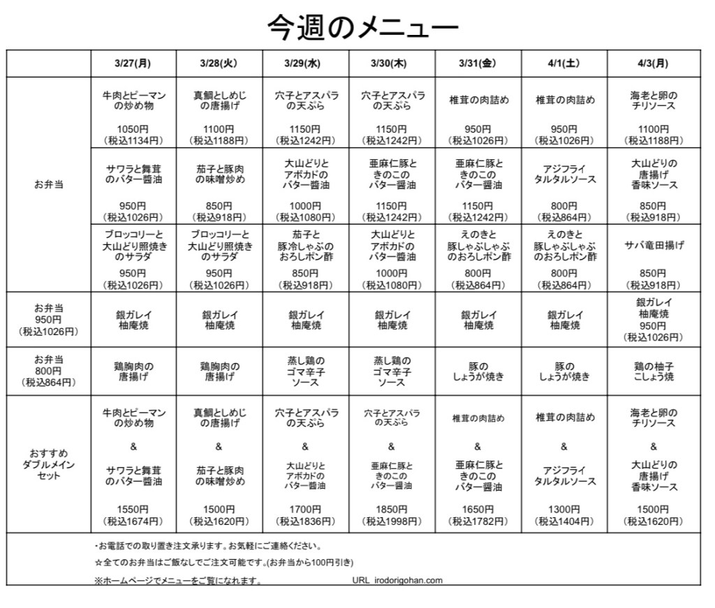 今週のメニュー表をご覧になり、インターネットまたはお電話にてご注文下さい。