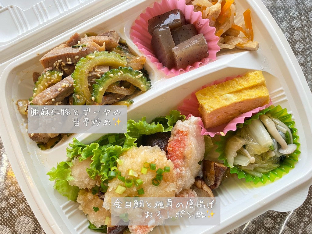 金目鯛と椎茸の唐揚げおろしポン酢&亜麻仁豚とゴーヤの甘辛炒め✨