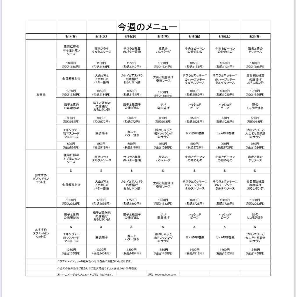 今週のメニュー表をご覧になり、インターネットまたはお電話にてご注文下さい。