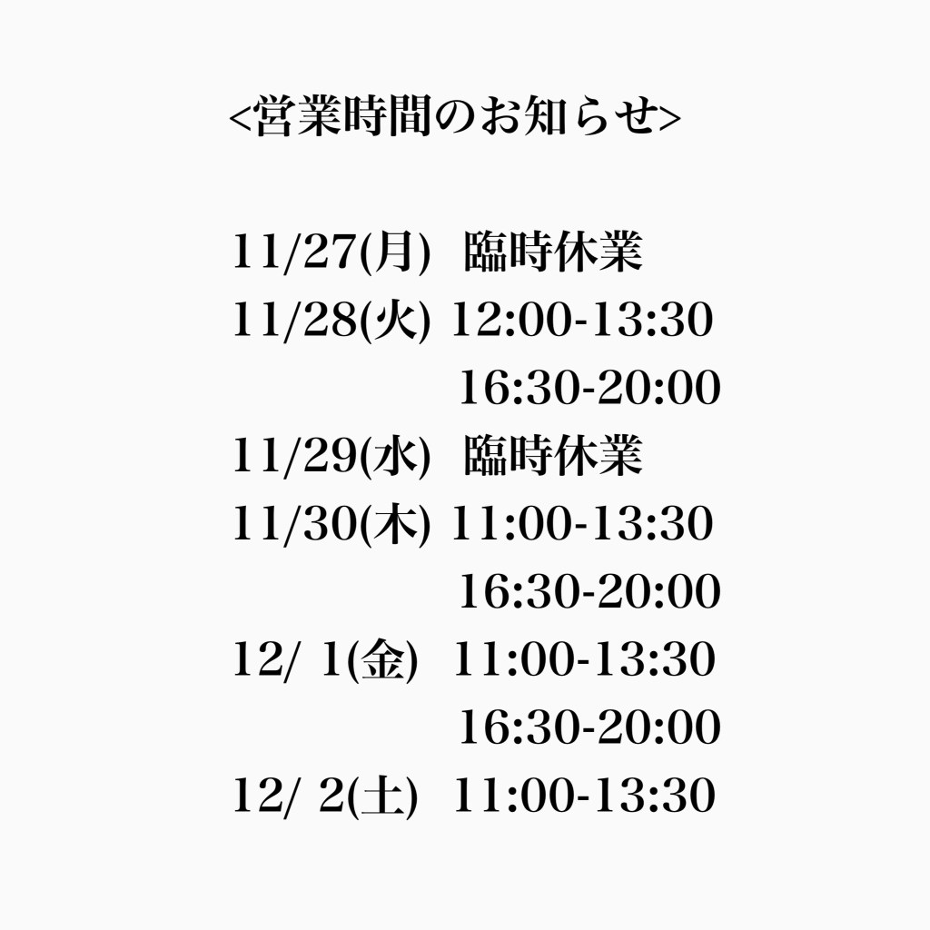 11/27(月)29(水)は都合により、休業させて頂きます。