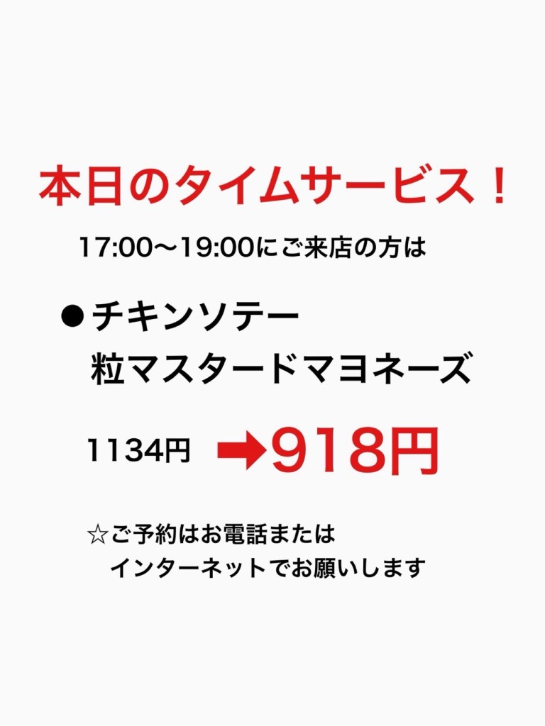 タイムサービスは夕方の17:00〜19:00に行います。