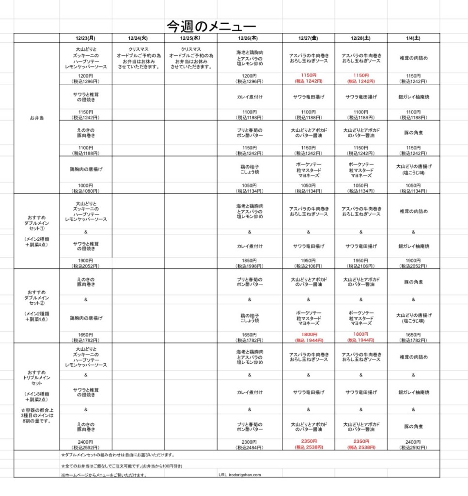 今週のメニュー表をご覧になり、インターネットまたはお電話にてご注文下さい。