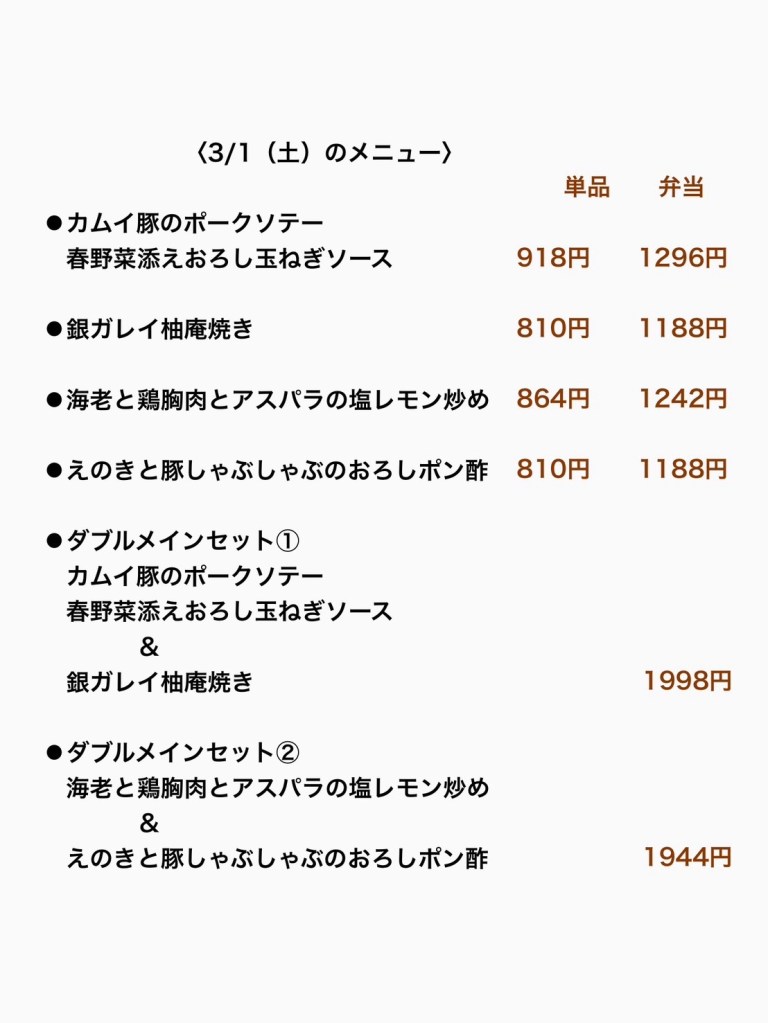 お弁当は日替わりです。毎日5種類のお弁当をご用意しています。また、メインを2種類お選びいただけるダブルメインセットも人気です。