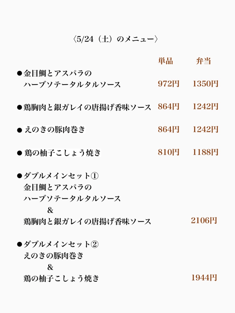 お弁当は日替わりです。毎日5種類のお弁当をご用意しています。また、メインを2種類お選びいただけるダブルメインセットも人気です。
