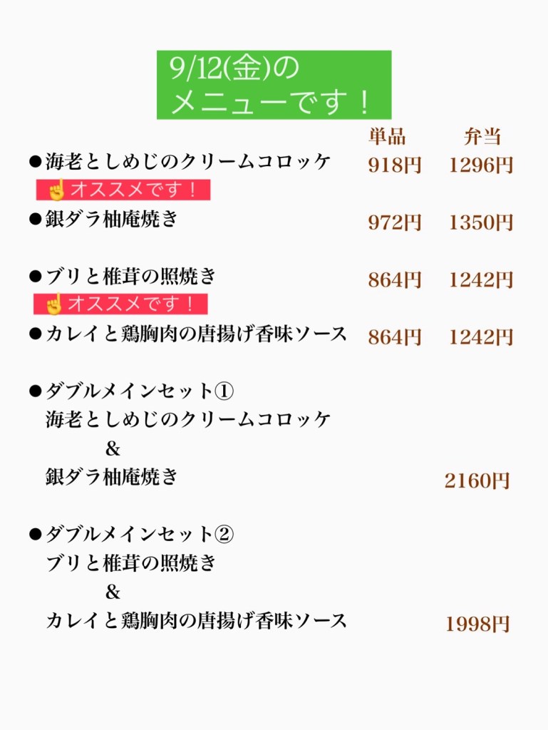 9/12(金)のメニューはこちら👇