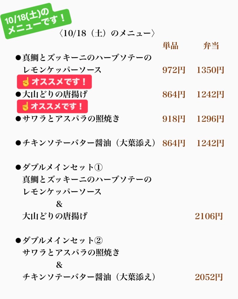 お弁当は日替わりです。毎日5種類のお弁当をご用意しています。また、メインを2種類お選びいただけるダブルメインセットも人気です。