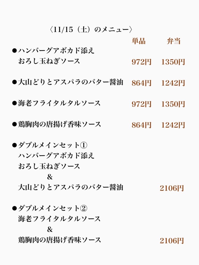 お弁当は日替わりです。毎日5種類のお弁当をご用意しています。また、メインを2種類お選びいただけるダブルメインセットも人気です。