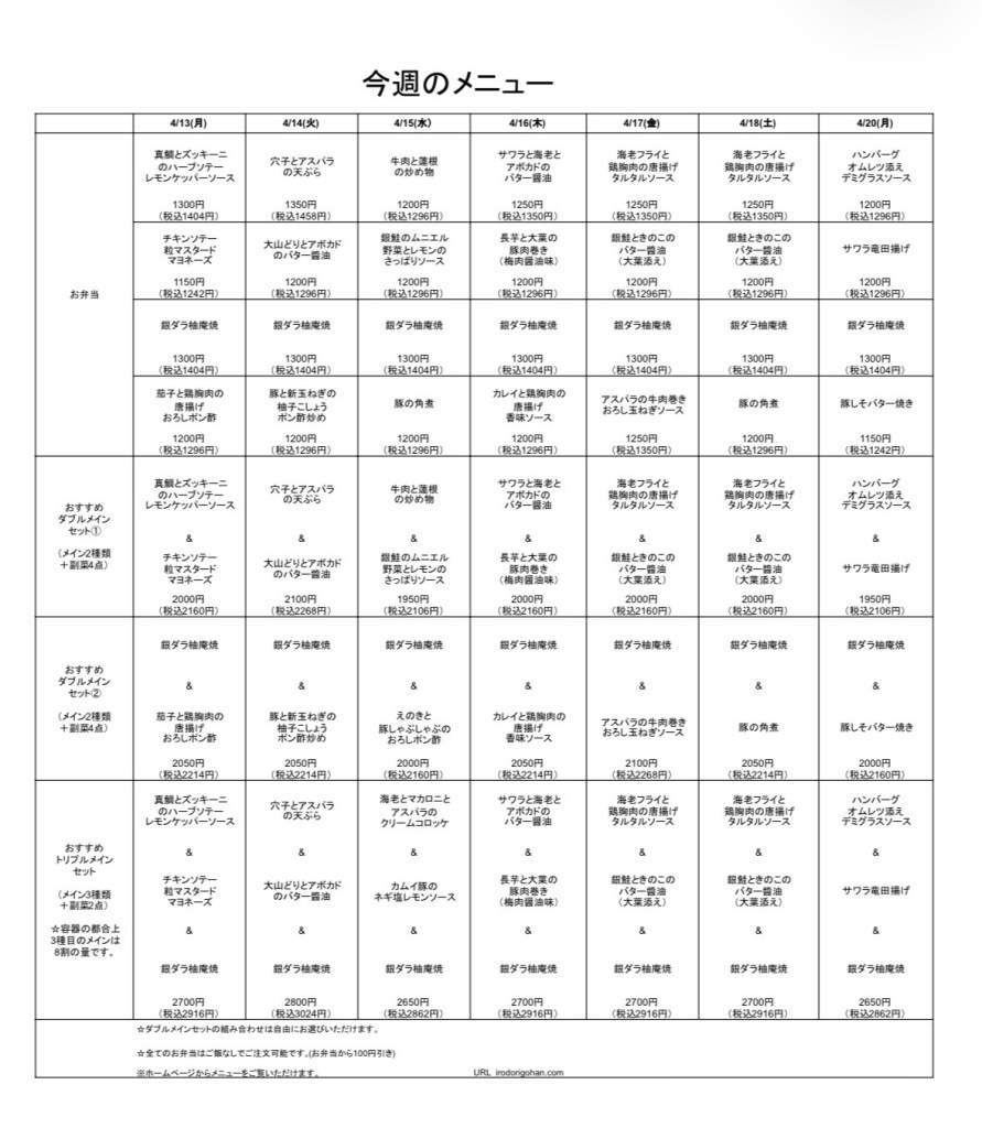 今週のメニュー表をご覧になり、インターネットまたはお電話にてご注文下さい。