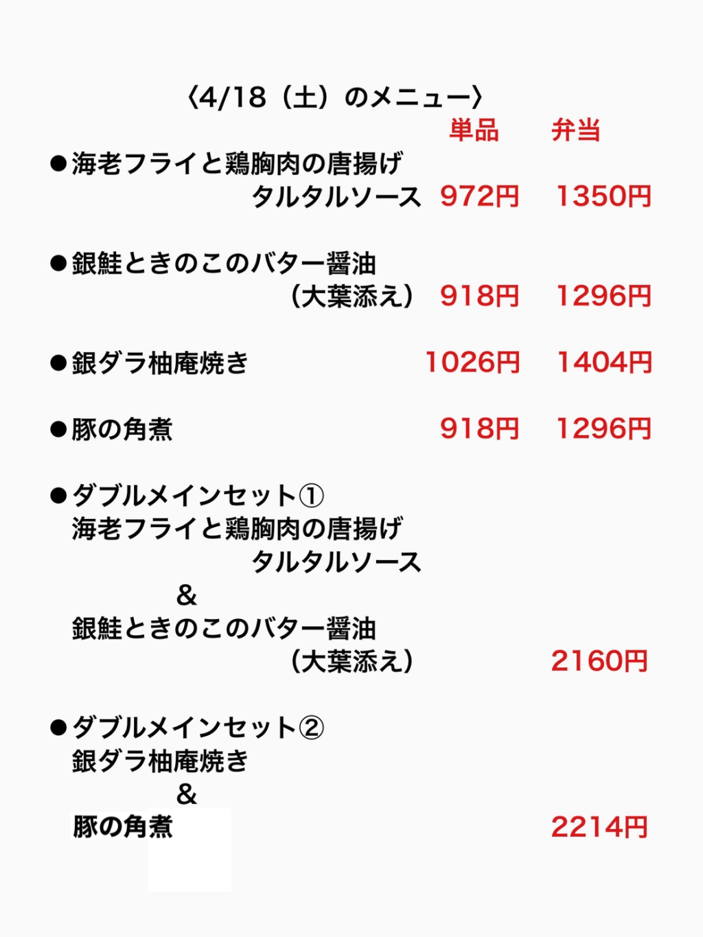お弁当は日替わりです。毎日5種類のお弁当をご用意しています。また、メインを2種類お選びいただけるダブルメインセットも人気です。