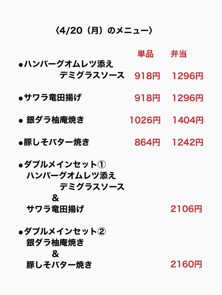 お弁当は日替わりです。毎日5種類のお弁当をご用意しています。また、メインを2種類お選びいただけるダブルメインセットも人気です。