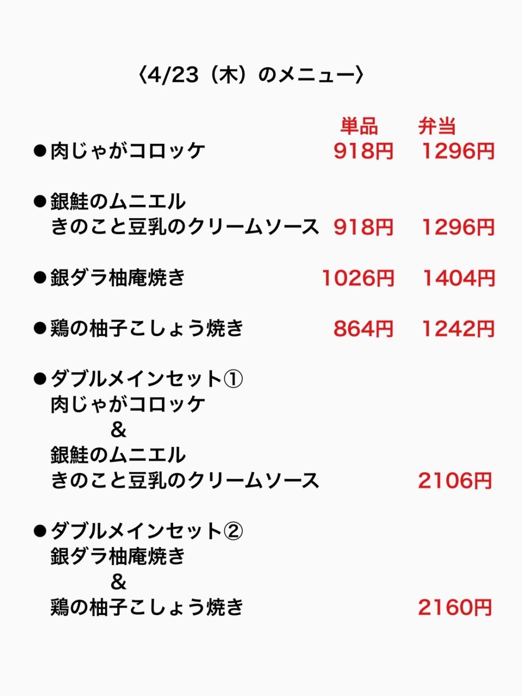 お弁当は日替わりです。毎日5種類のお弁当をご用意しています。また、メインを2種類お選びいただけるダブルメインセットも人気です。