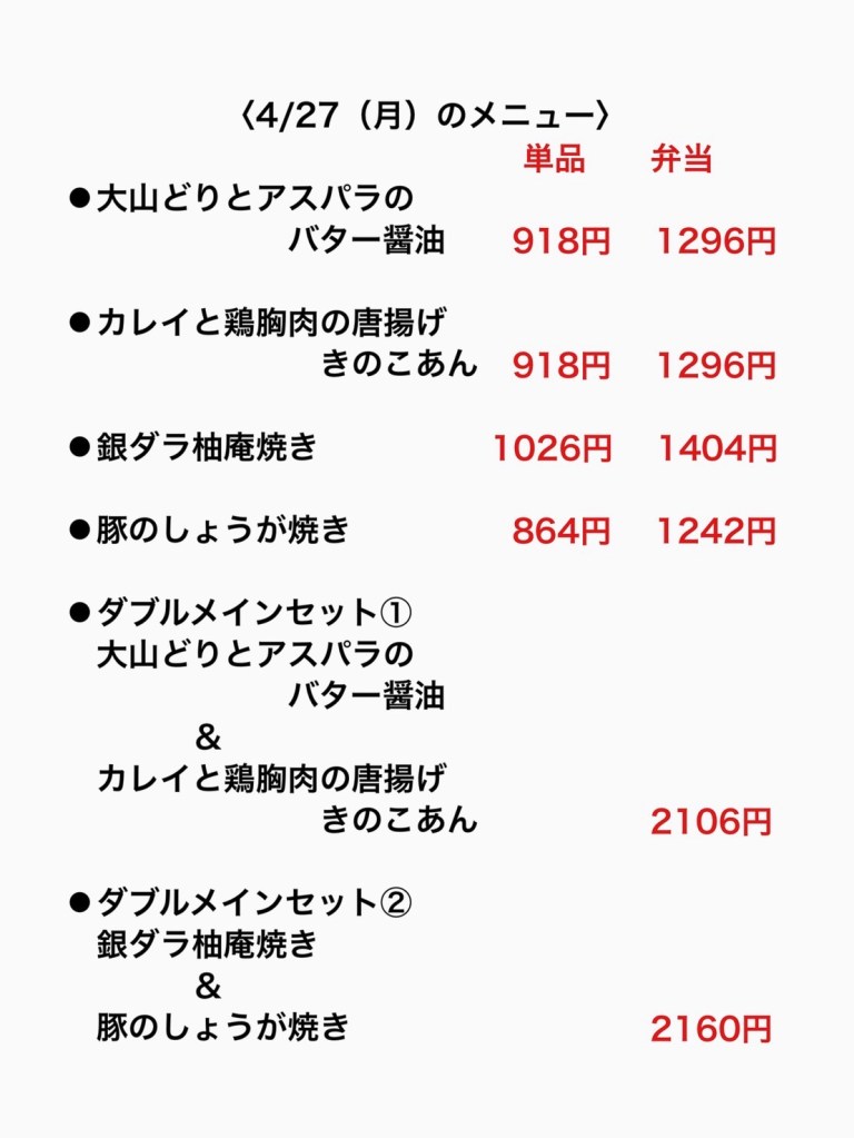 お弁当は日替わりです。毎日5種類のお弁当をご用意しています。また、メインを2種類お選びいただけるダブルメインセットも人気です。